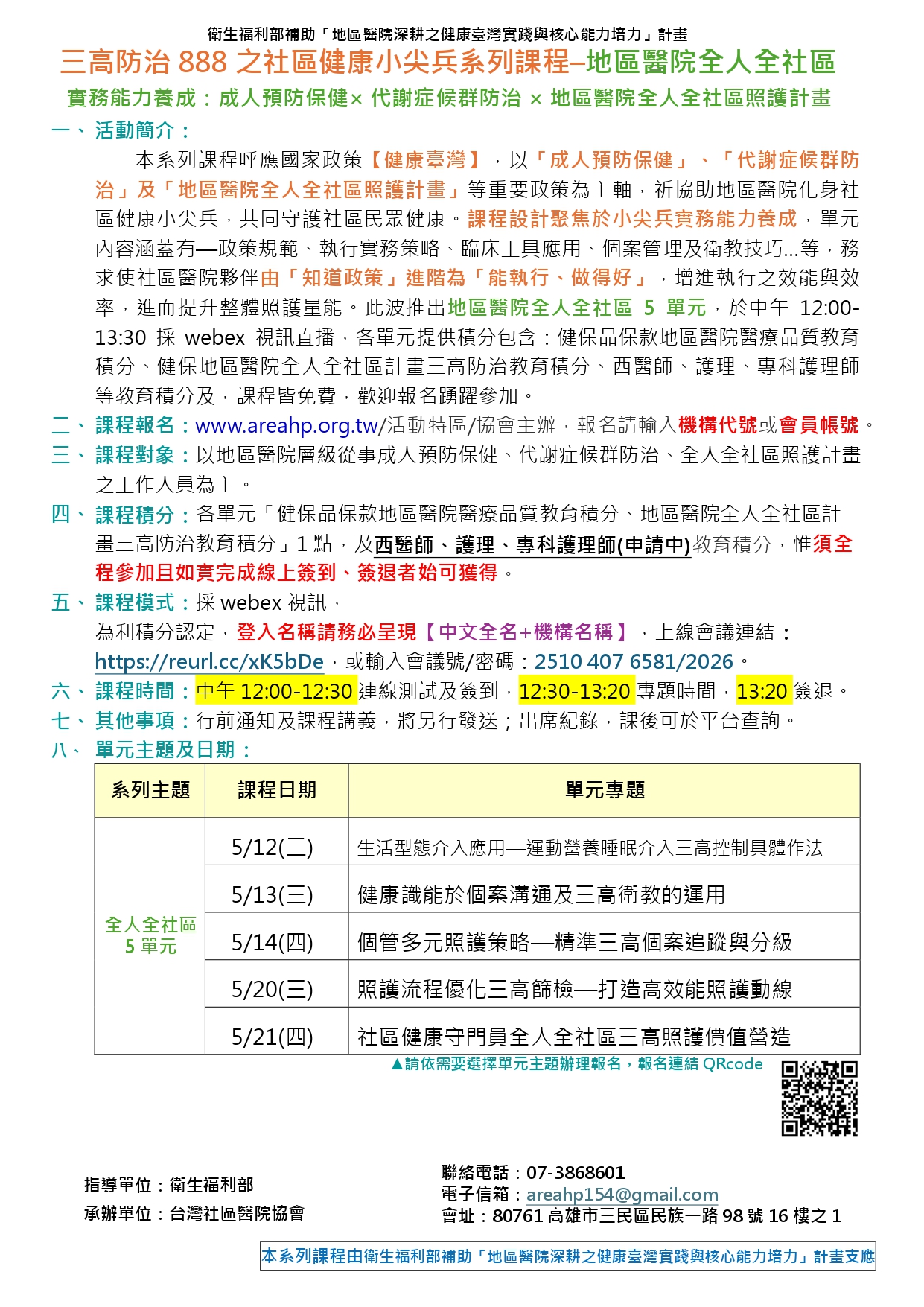 ★課程積分:各單元「健保品保款地區醫院醫療品質教育積分、地區醫院全人全社區計畫三高防治教育積分」1點,及西醫師、護理、專科護理師(申請中)教育積分,惟須全程參加且如實完成線上簽到、簽退者始可獲得。